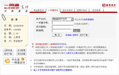 第三步:跳转到招商银行网银页面。请选择适合的支付类别,按要求填写信息(截图以一卡通支付为例),点“确定”提交。