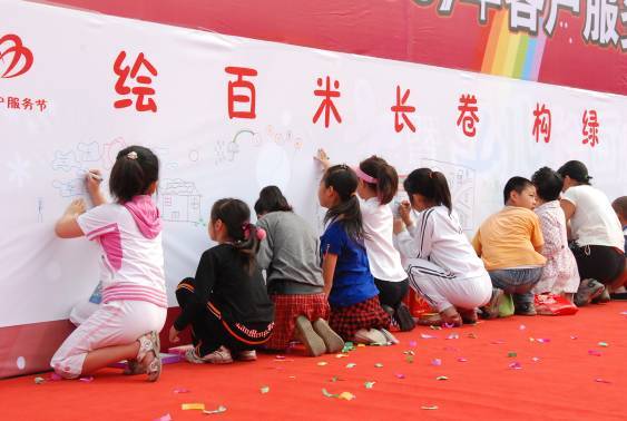 河北平安客户服务节不仅是快乐的节日,更是环保的节日,开幕式活动中处处体现了“环保”理念。本次开幕式活动与目前河北省会目前进行的“一年一大步,三年大变样”活动相关结合,活动主题确定为——“绘百米长卷,构绿色家园”,由小朋友们描绘家乡的碧水蓝天,号召全社会倡导绿色环保、构建绿色家园。