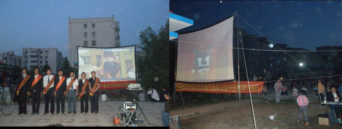活动当天,我们社区的服务专员与相关的工作人员提前到位准备晚上的活动,保证了电影能够按时播放。影片播放之前,我们的员工安排所有到场的观众到服务人员处领取免费抽奖的奖券,在电影播放过程种穿插抽奖的环节,让电影晚会更有意义,当天色逐渐暗下来但没有到电影播放的时间,我们安排了《平安基业》的播放,让更多的客户了解平安公司。